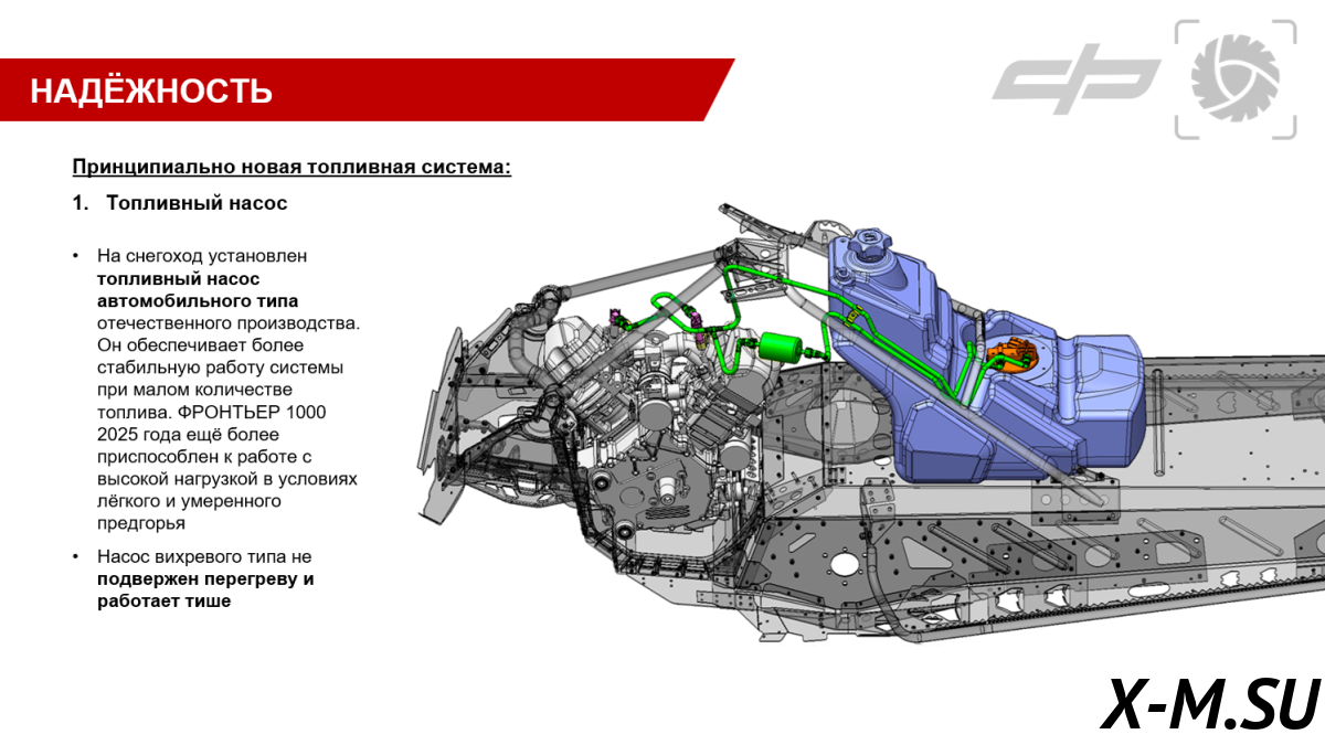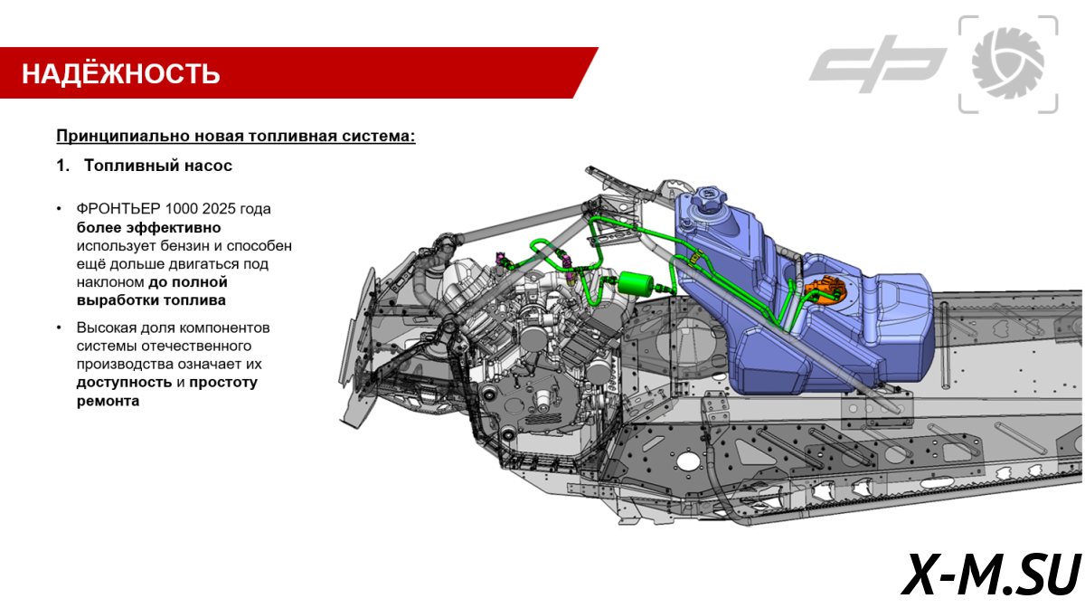 Конструкторы «Русской механики» к 2025 году сделали ФРОНТЬЕР 1000 ещё более комфортным, а его надёжность достигла абсолютно нового уровня. Благодаря изменённой топливной системе и системе охлаждения, ФРОНТЬЕР 1000 способен выдерживать значительные нагрузки ещё более длительное время.